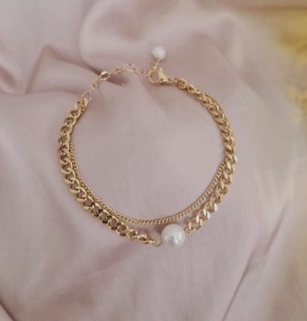 Bracelet en acier inoxydable double chaines avec perle nacrée