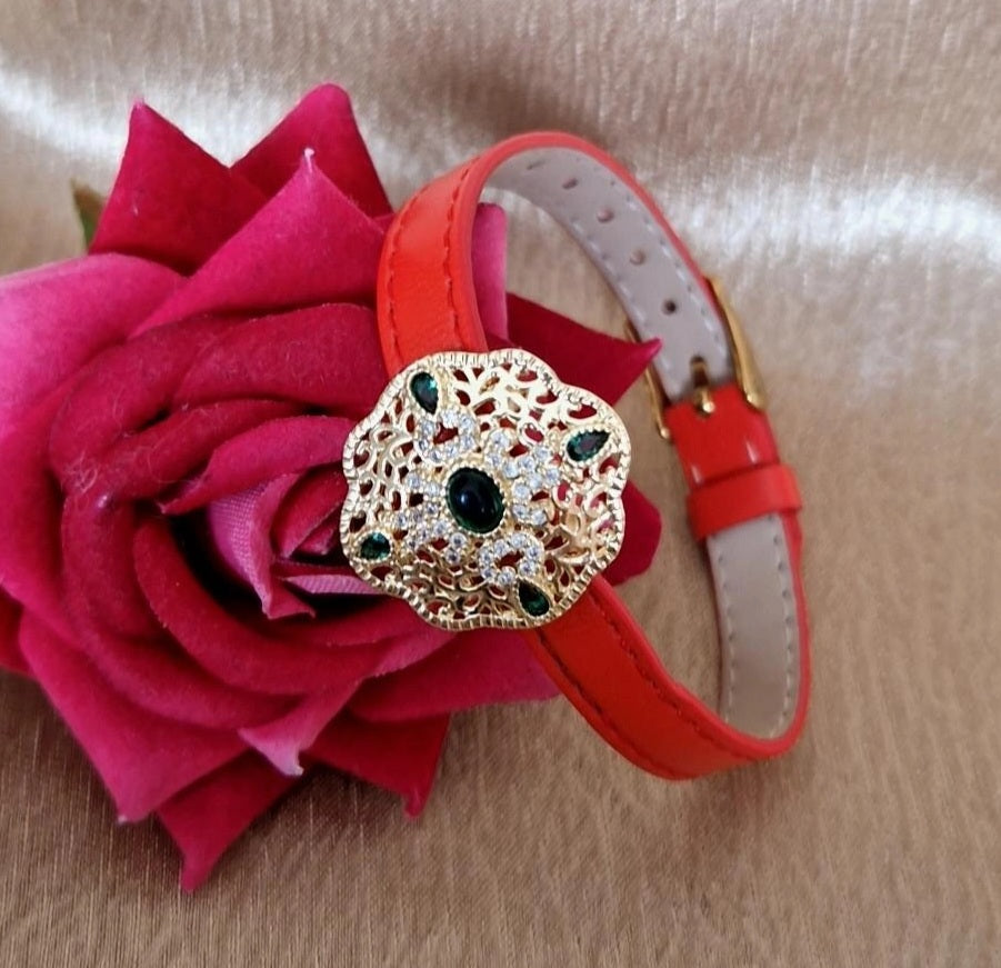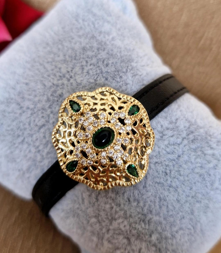 Bracelet en cuir avec pendentif beldi fleur pierres vertes