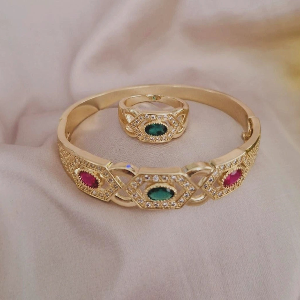 Ensemble Bracelet jonc et bague pierres rouge et verte